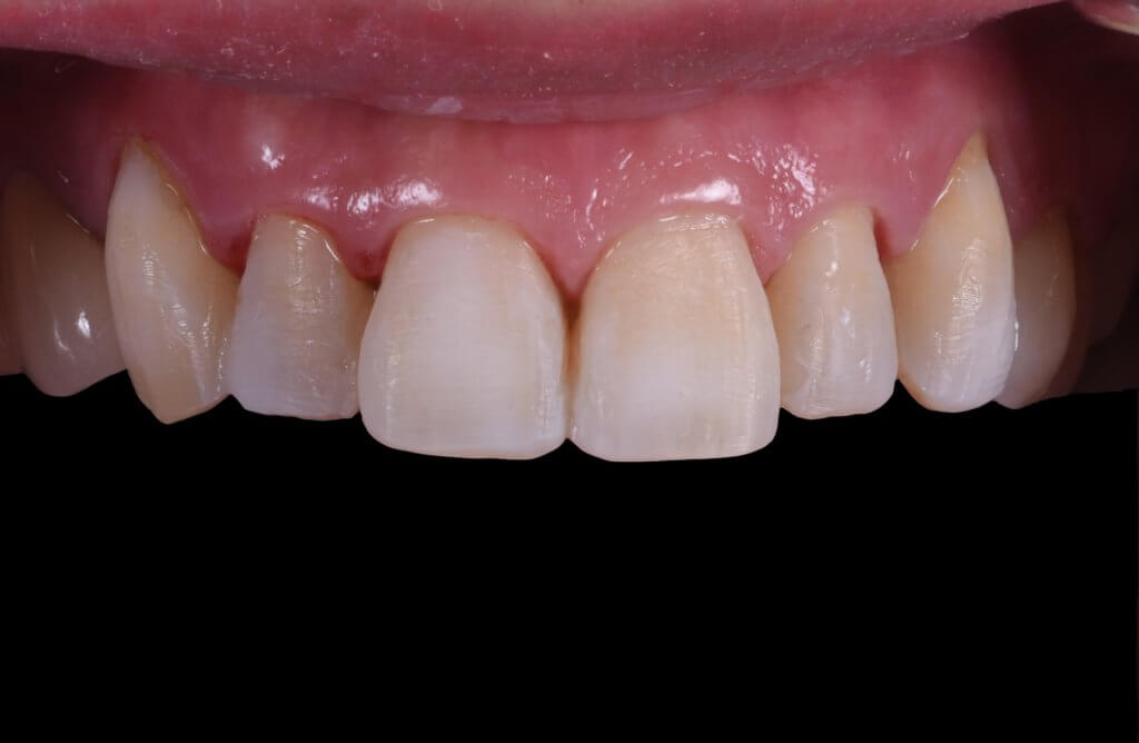 裝上七顆陶瓷貼片,兩個月後回診.可以發現貼上密合度極佳的陶瓷貼片.牙齦自然變得健康不紅腫.